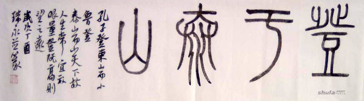 李瑞永作品,敬请点评!195作品尺寸136×35厘米。篆文“登于泰山”行书“孔子登东山而小鲁,登泰山而小天下。故人生常宜放眼量。登既高则望之远。”