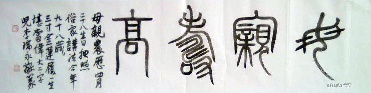 李瑞永作品,敬请点评!197作品尺寸136×35厘米。篆文“母亲寿高”行书“母亲农历四月二十八生曰。按照俗家讲法,今年九十八岁。三寸金莲履一生,堪当伟大二字。”