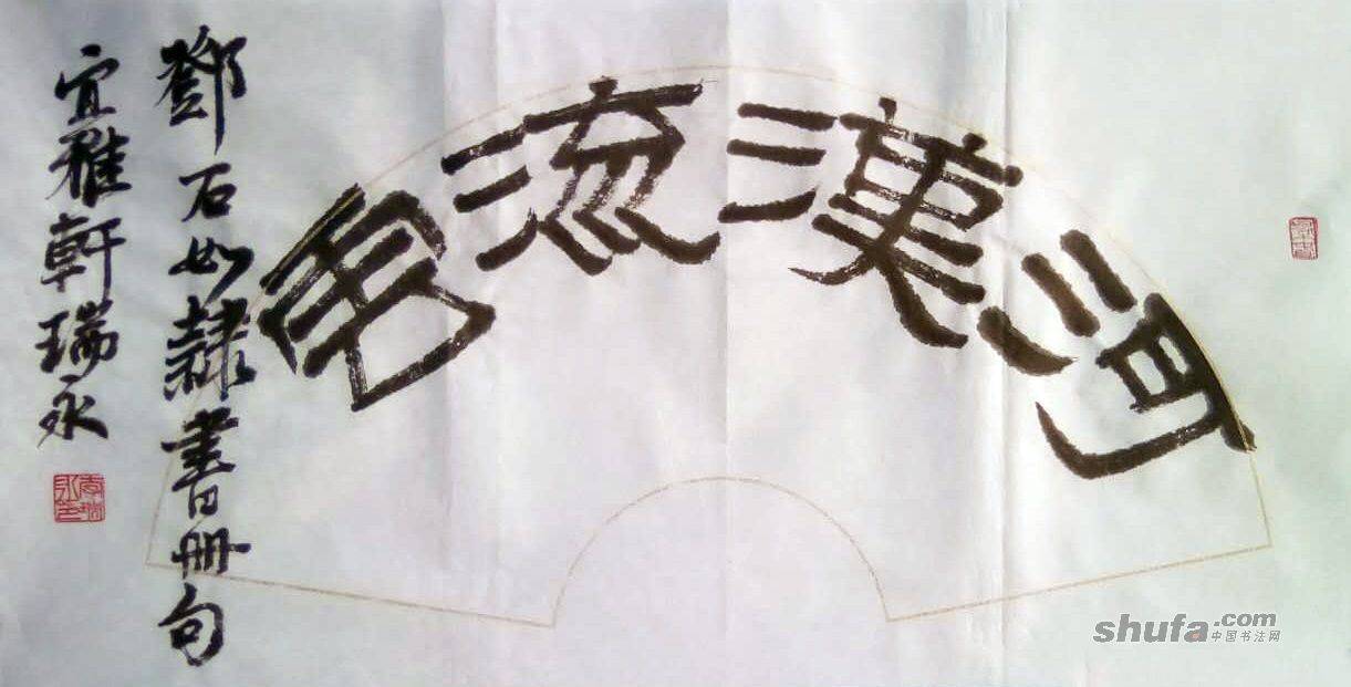 李瑞永作品,敬请点评!213作品尺寸68×34厘米。扇面内容“河汉流云。邓石如隶书册句。”