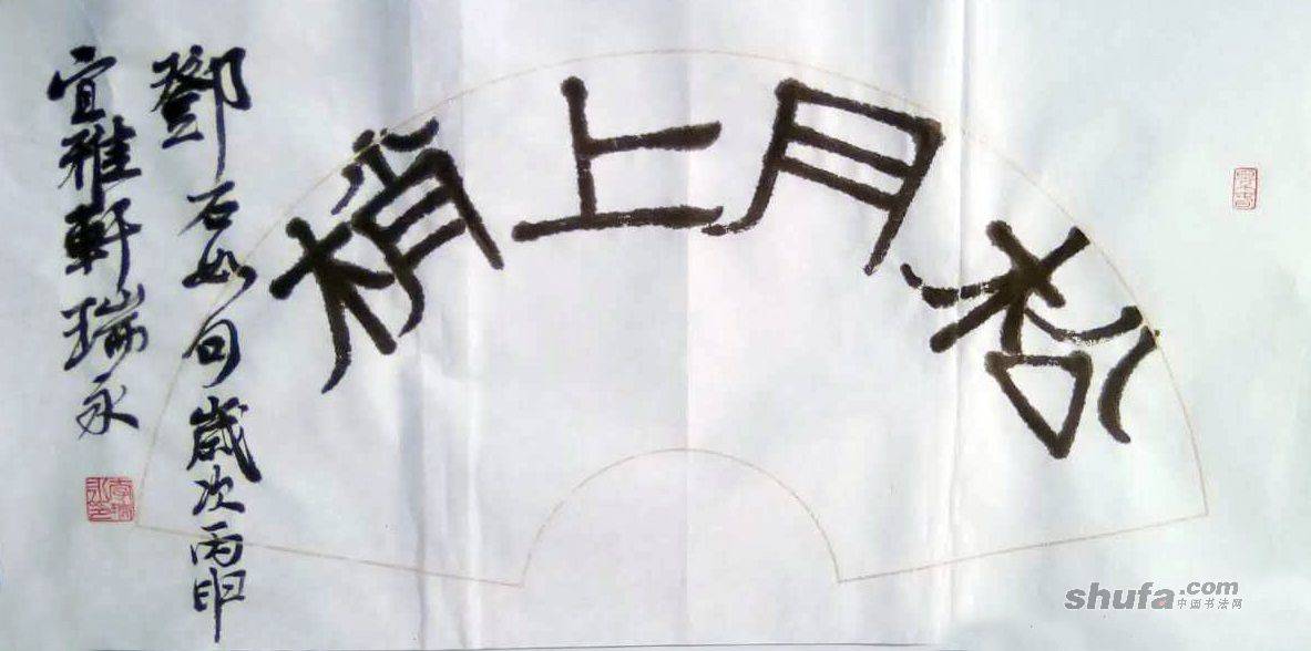 李瑞永作品,敬请点评!216作品尺寸68×34厘米。扇面内容“松月上梢。邓石如句”
