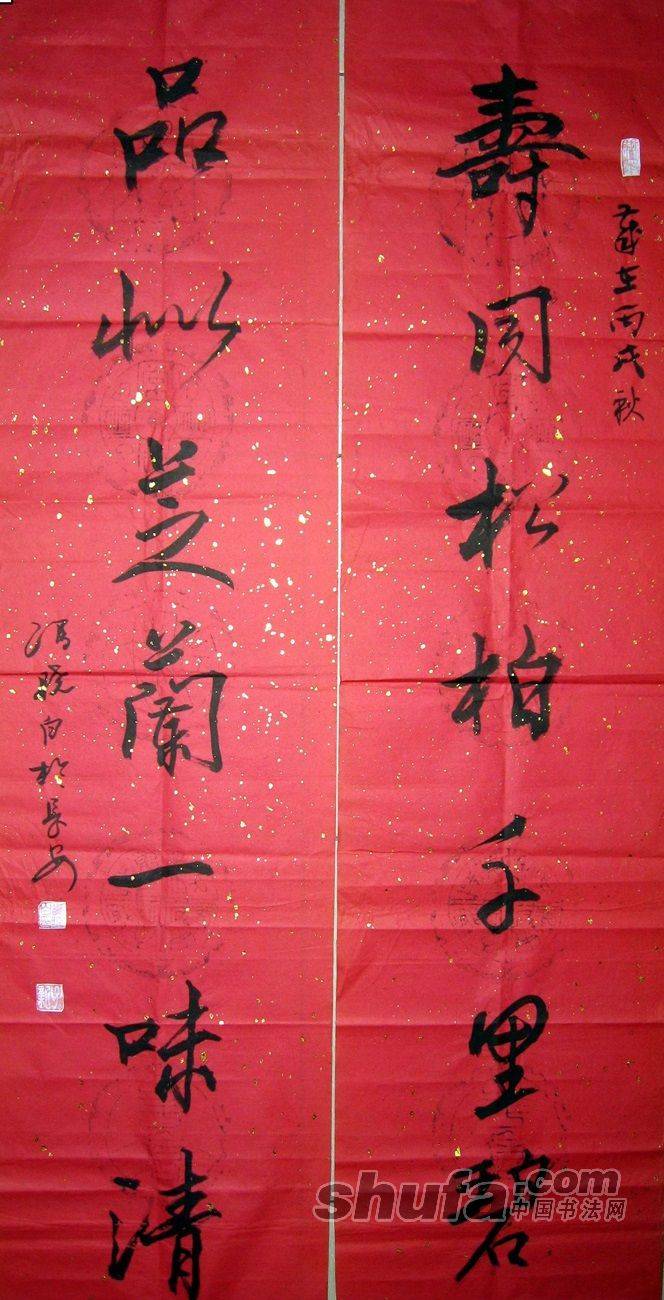 书法(行书)(丙戌作):寿同松柏千里碧(4尺对联红纸)