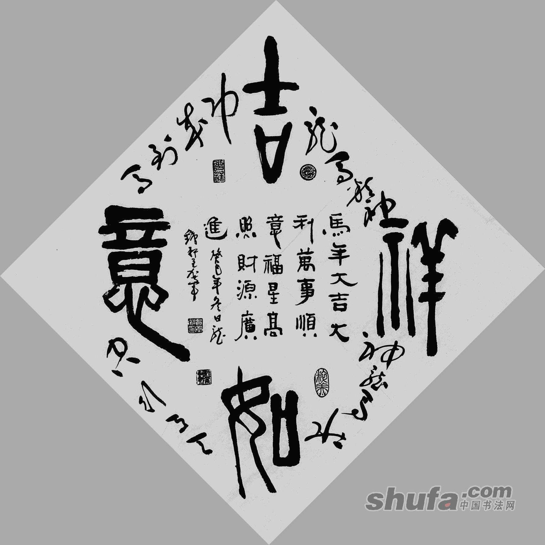 2.贺军自创书写新章法之作。吉祥如意(草书、隶书、篆书三体结合之作)