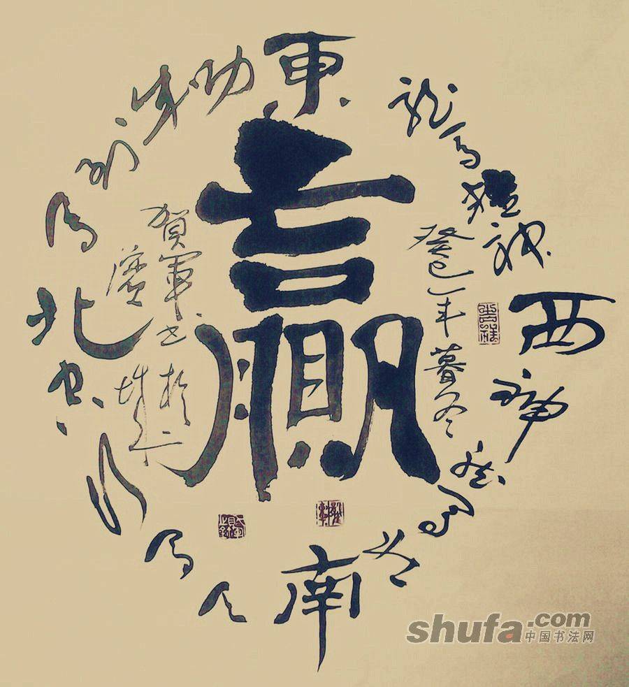 3.贺军自创书写新章法之作。赢(草书、隶书、行书三体结合之作)