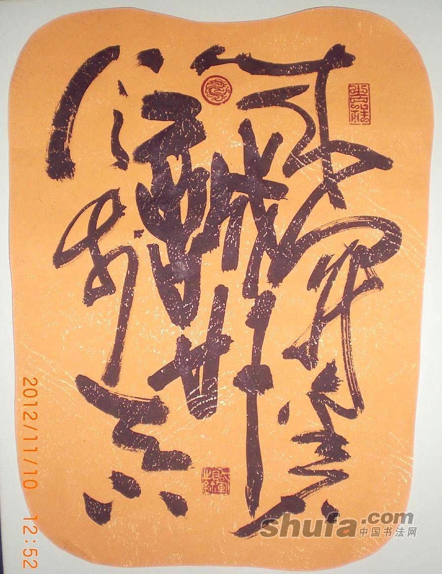 5.贺军自创书写新章法之作。诚信(大篆)。诚开金石,信步天下(草书)。(两种字体融合创新)