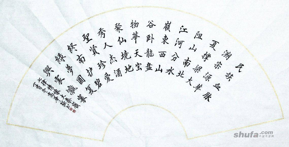 高华强楷书二尺扇面自撰七律“情怀大秦岭”34X68cm