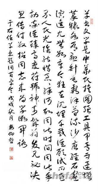 草书文字,是中华民族自强工具。甲骨而还增篆隶,各有悬针垂露。汉简流沙,唐经石窟, 演进尤无数。章今狂在,沉埋千载谁顾!试问世界人民,光阴能惜,急急缘何故?同此时间同此手,效率谁臻高度?符号神奇,髯翁发现,秘诀思传付。敬招同志,来为学术开路。《于右任草书题词百字令》
