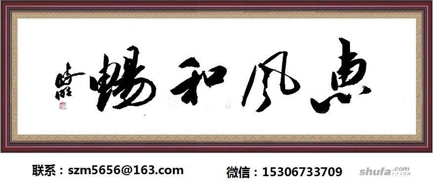 惠风和畅 书法情感基调:清新柔和 创新亮点:柔和飘逸的基调与内容的形象和思想情感相一致。笔画温和清新,运笔轻柔流畅,如惠风飘逸,似水上来风,书法形式(美)和内容(美)相统一。书写这样主题内容的字,也不要用狂草体,不要用豪放的书风,不要有粗犷的笔画,因为这些书体、书风、笔画与“惠风和畅”主题思想意义牛头不对马嘴,其形式无法体现其内涵,艺术意义荡然无存。 创新特色:书法形象、思想和情感相统一,形式(美)与内容(美)相统一。
