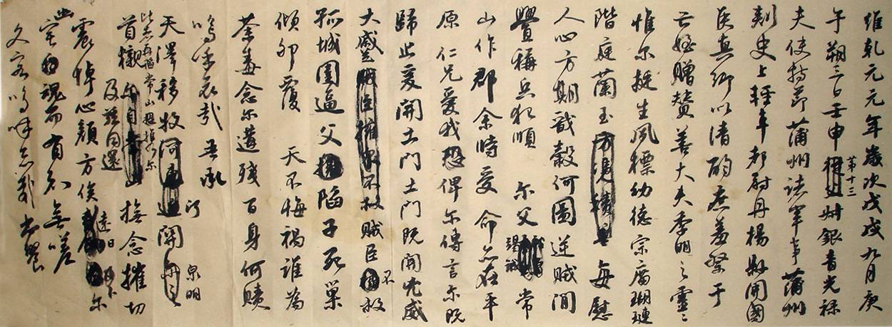 维乾元元年。岁次戊戌。九月。庚午朔。三日壬申。第十三(从父涂去)。叔银青光禄(脱大字)夫使持节蒲州诸军事。蒲州刺史。上轻车都尉。丹阳县开国侯真卿。以清酌庶羞。祭於亡姪赠赞善大夫季明之灵曰。惟尔挺生。夙标幼德。宗庙瑚璉。阶庭兰玉。(方凭积善涂去)。每慰人心。方期戩穀。何图逆贼开衅。称兵犯顺。尔父竭诚。(□制涂去改被胁再涂去)。常山作郡。余时受命。亦在平原。仁兄爱我。(恐涂去)。俾尔传言。尔既归止。爰开土门。土门既开。凶威大蹙。(贼臣拥眾不救涂去)。贼臣不(拥涂去)救。孤城围逼。父(擒涂去)。陷子死。巢倾卵覆。天不悔祸。谁為荼毒。念尔遘残。百身何赎。呜乎哀哉。吾承天泽。移牧河关。(河东近涂去)。泉明(尔之涂去)比者。再陷常山。(提涂去)。携尔首櫬。及兹同还。(亦自常山涂去)。抚念摧切。震悼心顏。方俟远日。(涂去二字不辨)。卜(再涂去一字不可辨)。尔幽宅。(抚涂去)。魂而有知。无嗟久客。呜呼哀哉尚饗。