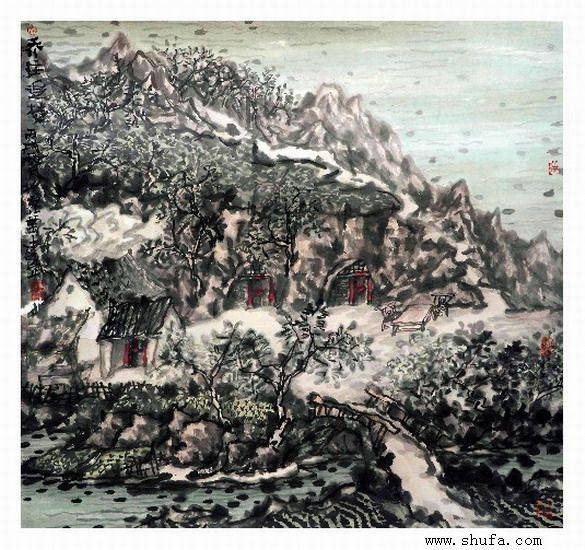 他采用现实主义和浪漫主义相结合的手法,运用铺张而不虚伪,华丽而有法度的笔法,色彩浓郁,气韵生动,使故乡在他的笔下幻化出万种风情,将人们引至一个意象丰富、情韵精微,充满光华神致的境界。创造性地将传统古朴纯厚的山水画烙上了具有现代审美情趣的时代印记,极具独特风格和艺术魅力。