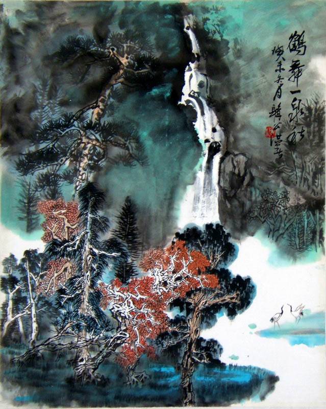 山水画-鹤舞一泉秋,用青绿山水手法表现鹤姿泉韵