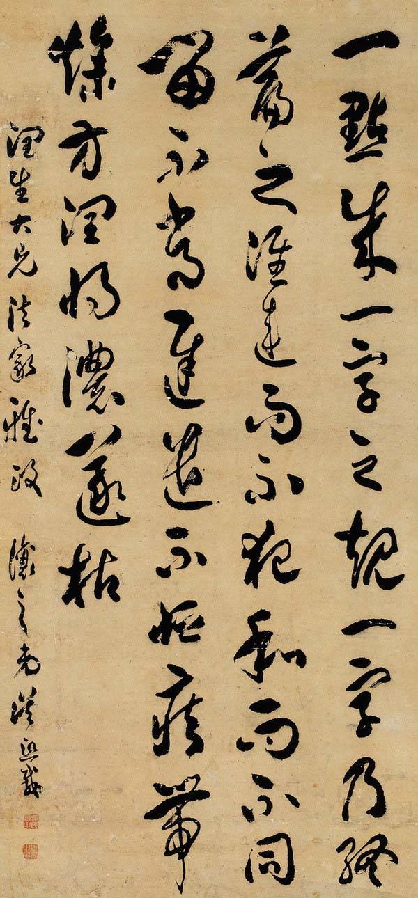 草书立轴 释文:一点成一字之规,一字乃终篇之准,违而不犯,和而不同,留不当迟,送不嫉疾,带燥方润,将浓遂枯。润生大兄法家雅政,让之弟吴熙载。