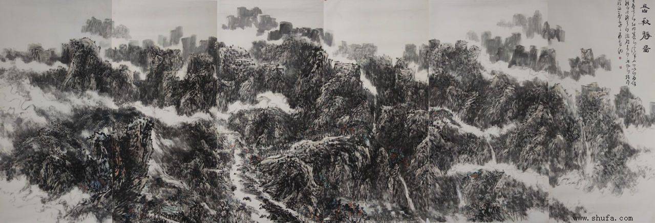 此画由六张八尺整幅连成,画高2.48米,宽7.74米。是刘灿章先生多次游山而创作的佳构巨挚,山中烟云环绕,飞瀑奔流,松风摇曳,气象万千.它有太行之雄姿,嵩山之美妙,伏牛山之葱茏,大别山之清秀。 此画气势磅礴,境界幽深,奇峰秀水,跨越时空,尽倾刘灿章先生山水痴情之心。融会了中国山水的风神