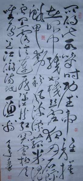 祝允明,字希哲,明代书法家,为"吴中四才子"之一.他各体兼擅,尤精小楷大草.祝允明草书学怀素\黄庭坚,而自出新意,被王世贞称为:"变化出入,不可端倪,风骨烂漫,天真纵逸." 这件<<杜甫诗轴>>不分字距和行距,通篇几如见缝插针,但字与字很少连属,完全依靠字型来达到避让穿插,上下贯通,再加上如狂风骤雨,横扫千军的行笔,使作品保持了一泻千里的磅礴之势,这不能不说是一个奇迹.