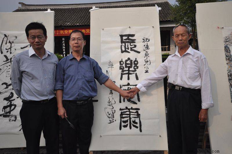 云深书坛创办人孙兴建(左一)与父亲(右一)与阳逻文化馆原馆长彭新峰合影