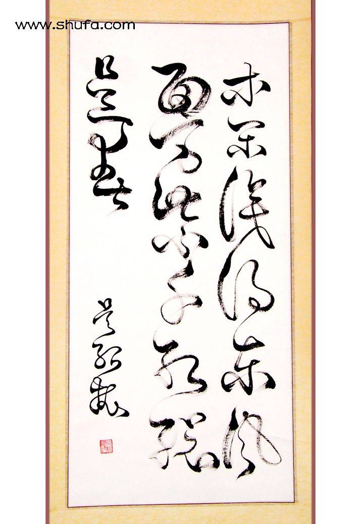 圆转飞动、变幻无穷、运笔如骤雨旋风、龙飞凤舞、大气磅礴、在章法布白上,纵横驰骋、神采飞动、一挥而就、如醉如狂、奇幻百出、三字五字相连,一行相连、气吞山河。把张芝、张旭、怀素、王羲之、王献之的笔法巧妙的融为一体。浑然天成、几篇狂草的章法实际上是把一幅字当做一个字来写,是线的一流构筑,是线的交响乐章,这种出神入化的书法艺术精品,震撼人心,绍振的确创造了一个奇迹。详细介绍请查询书法家网址:www.wushikuangcao.com