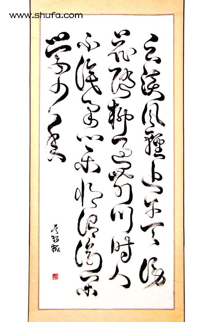 圆转飞动、变幻无穷、运笔如骤雨旋风、龙飞凤舞、大气磅礴、在章法布白上,纵横驰骋、神采飞动、一挥而就、如醉如狂、奇幻百出、三字五字相连,一行相连、气吞山河。把张芝、张旭、怀素、王羲之、王献之的笔法巧妙的融为一体。浑然天成、几篇狂草的章法实际上是把一幅字当做一个字来写,是线的一流构筑,是线的交响乐章,这种出神入化的书法艺术精品,震撼人心,绍振的确创造了一个奇迹。详细介绍请查询书法家网址:www.wushikuangcao.com
