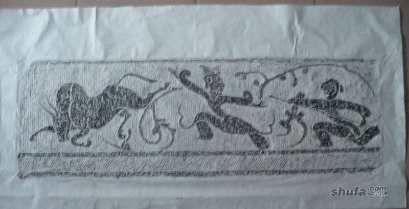 《斗牛搏技》汉画像石拓本 像石130x45x20cm, ,出自南阳市南郊一河床。 画左一牛牛,垂首翘尾向前猛冲,牛气十足,力大勇悍,势不可挡。画右二人,一人持矛,一人徒手,搏斗技击。技击始于战国,是属于徒手或持戒格斗的技能。见《汉书.刑法志》:“齐愍以技强”孟康注曰:“兵家之技巧。技巧者,便器械,积机关,以立攻守之胜。”