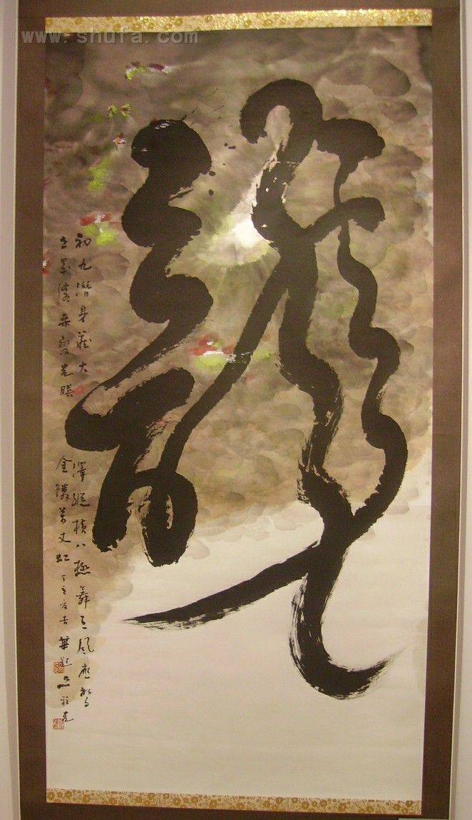 《咏龙》 初九潜身藏大泽。纵横八极舞天风。 应惊世界沧桑变。光映金鳞万丈虹。 参加2007年10月1日至13日在釜山文化会馆举行[第二回韩国釜山书艺双年展]作品