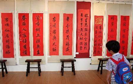 一名小学生在会场津津有味地欣赏春联作品 (新华社照片)