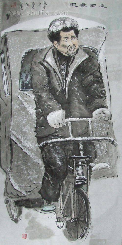 作品显示了08年春节不怕风雪,风雨无阻继续冒雨冒雪拉人作背景,充分彰显了人民对生活的向往。