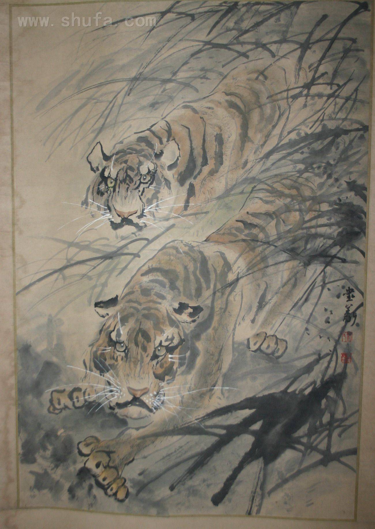 采用写意手法,黑夜草丛中两只老虎在觅食!