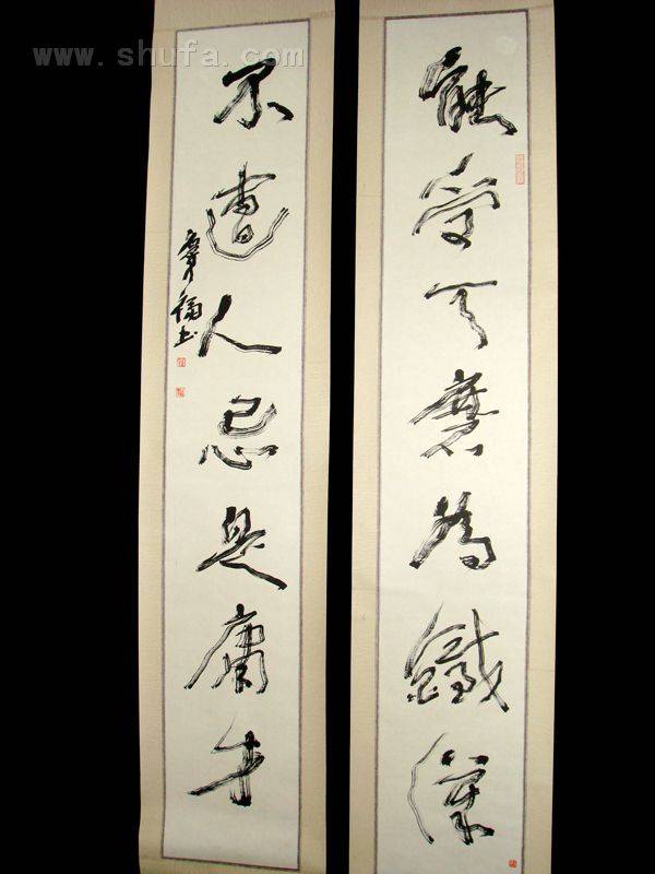 曾学过张、怀、王、米、何(绍基)等书家的大量草书遗迹,这幅对联原本是隶书创作的。后来,尝试了草书书写,更觉能表达所思意境,方才书写的。