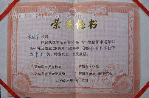 2006年纪念红军长征胜利70周年暨信阳市老年书画研究会成立20周年书画展一等奖。
