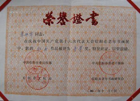 2002年庆祝中共十六大胜利召开信阳市老年书画展荣获一等奖。