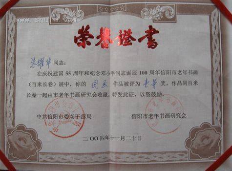 2004年纪念邓小平诞辰100周年信阳市老年书画展一等奖。