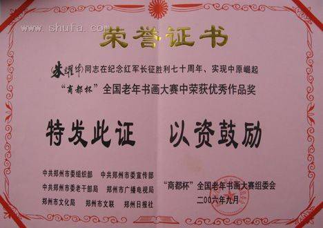纪念红军长征七十周年“商都杯”全国老年书画大赛荣获优秀奖。