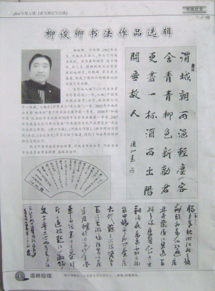 柳俊青(曾用名:柳俊卿)字欣耕,1962年生,河南沈丘县人,毕业于河南书画院。出身书香世家,自幼酷爱书法,潜心苦练,深谙颜、柳、欧、赵体精髓,擅长魏碑、草书。1989年在郑州书法函授院深造,与著名书法家张海(现中国书协主席)、宋华平(河南书协主席)等老师多次交流、探讨,从中吸取精华,完善了自己的书法艺术,其魏碑峻拔遒美、浑厚高古、气势恢宏。草书潇洒自如、气韵流畅、刚柔并济、熔古纳今,形成了独树一帜、遒劲而舒畅豪放的书法艺术风格。