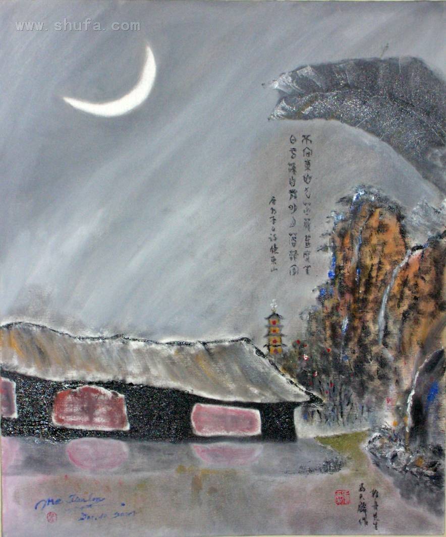 此画乃根据唐代诗人李白的《忆东山》而创作。诗句为: 不向东山久,蔷薇几度花? 白云还自散,明月落谁家? 作者以甲骨文录写于画中,作于2007年12月。 售价:5000元。