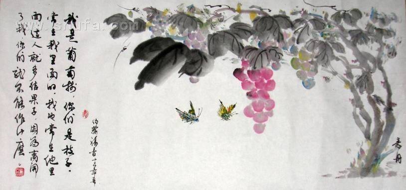 [国画]: 葡萄是甜蜜和心爱的大自然的典型硕果象征。 本作品作于2006年。 售价:800元。
