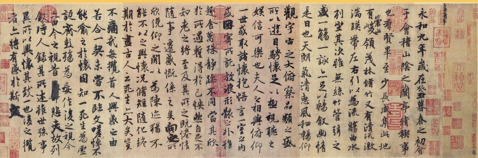 东晋永和九年( 公元353年 )三月三日,王羲之和居住在山阴的一些文人来到兰亭举行“修禊”之典,大家即兴写下了许多诗篇。《兰亭序》就是王羲之为这个诗集写的序文手稿。序文受当时南方士族阶层信奉的老庄思想影响颇深,在文学史上占有一定的地位。全文共二十八行,三百二十四字,章法、结构、笔法都很完美。王羲之的行书在当时独树一帜,后人评道“右军字体,古法一变。其雄秀之气,出于天然,故古今以为师法”。历代书家都推《兰亭序》为“天下第一行书”。