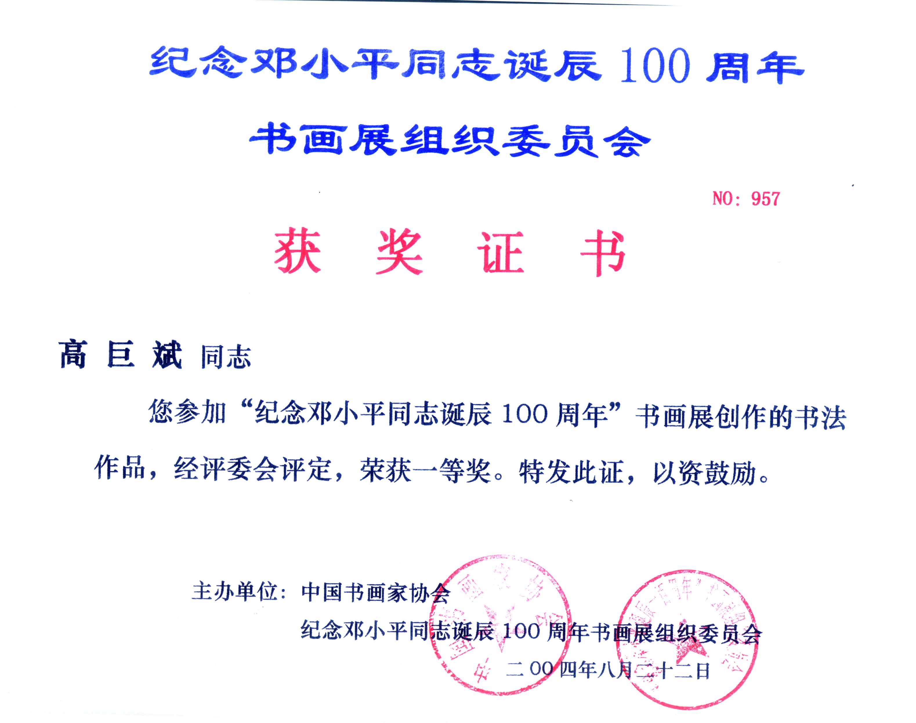 邓小平诞辰100周年 获奖证书