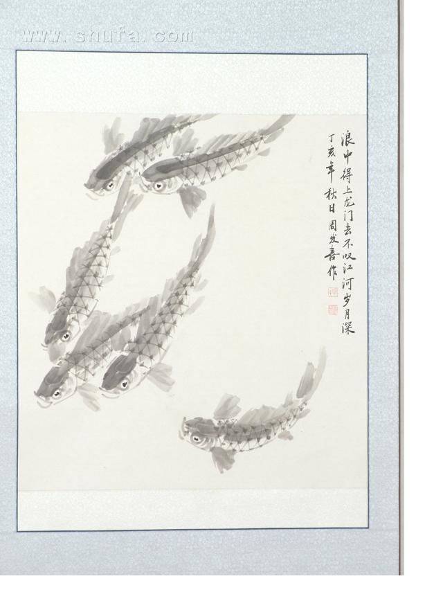 国画<<鱼>>,创作于2007年10月,画上题款为:浪中得上龙门去 不叹江河岁月深 丁亥年秋日周发喜作