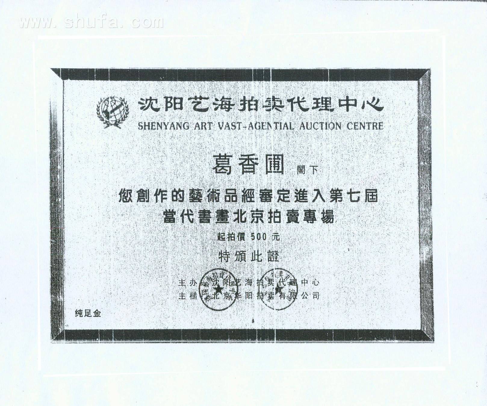 葛香圃获奖证书