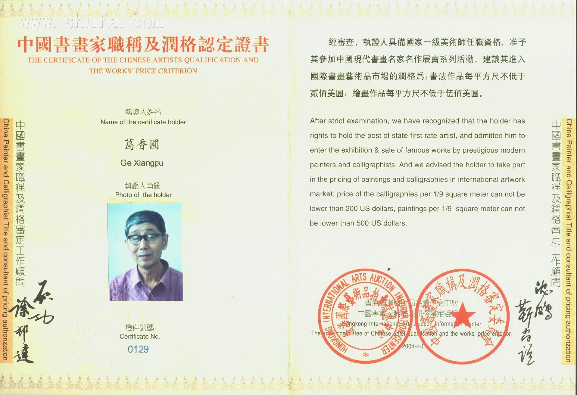 葛香圃获奖证书
