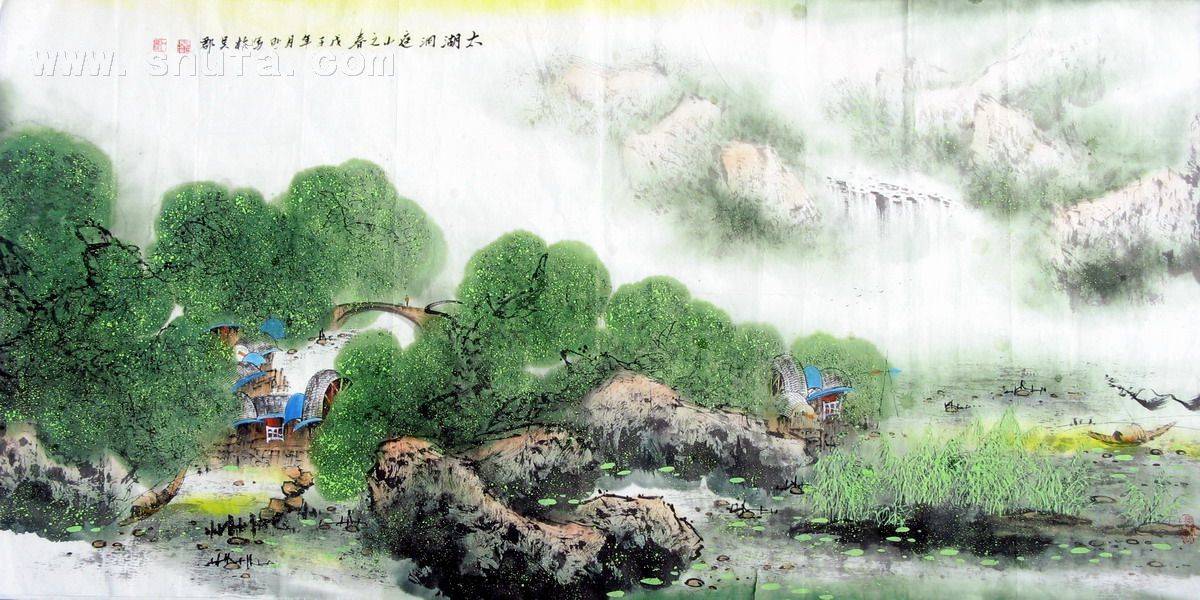 作品墨酣笔畅、富于变化、润泽大气,极具个性。探得大自然之灵性,写出天地之浩然,尽情、尽理、尽意、尽兴,融会众法,博采中西。用笔、用墨、用色、用水,挥之洒洒,流畅自如,气韵生动。并竭力创作心中的诗意画。却知画活山水的自然景致,需心性之真情流露。在滋润与秀美的水墨世界里,努力做到“搜尽奇峰打草稿”。他山水画里的山峦迭嶂、瀑布飞泉、山路樵夫、耕牛梯田,是江南的“风景旧曾谙”,却仍见空气湿润、云雾苍茫,表现出“天青、水静、人悠远”的境界。
