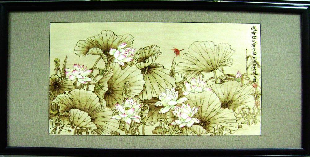 烙画:又名烫画。初为烙花,后成烙画。其源于西汉,盛于东汉。期间几经衰落,后虽被清代艺人重新整理,形成以河南为主的烙画群体!现代烙画是利用加热300-800摄氏度的特制铁烙笔和利用220v的电烙铁通过碳化原理、控温技巧以及熟练的绘画技艺,在木板、宣纸、丝绢等材料上作画。画面呈茶褐色,古朴典雅,别具一格. 郑州碧波园珍宝大世界烙艺阁画廊主要经营木板烙画,烙画的花色品种丰富,山水、花鸟、人物、动物、肖像、书法、中国画、西洋画、卡通画、大中堂、小中堂、条屏、壁画以及数十米的长卷、制作招牌、各种艺术品装裱,题材广泛,应有尽有,可以根据顾客需要的图案尺寸定做!现在正在招收学员欢迎有兴趣的朋友加入!