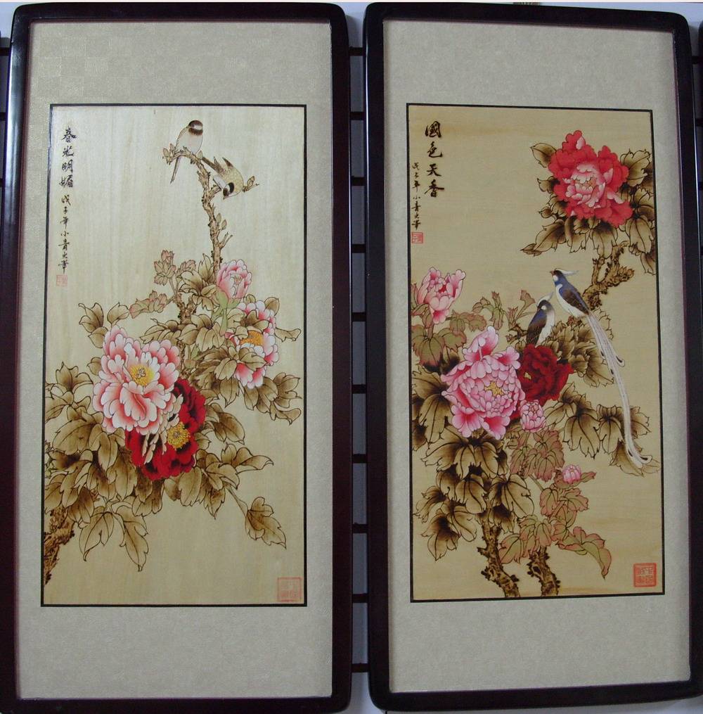 烙画:又名烫画。初为烙花,后成烙画。其源于西汉,盛于东汉。期间几经衰落,后虽被清代艺人重新整理,形成以河南为主的烙画群体!现代烙画是利用加热300-800摄氏度的特制铁烙笔和利用220v的电烙铁通过碳化原理、控温技巧以及熟练的绘画技艺,在木板、宣纸、丝绢等材料上作画。画面呈茶褐色,古朴典雅,别具一格. 郑州碧波园珍宝大世界烙艺阁画廊主要经营木板烙画,烙画的花色品种丰富,山水、花鸟、人物、动物、肖像、书法、中国画、西洋画、卡通画、大中堂、小中堂、条屏、壁画以及数十米的长卷、制作招牌、各种艺术品装裱,题材广泛,应有尽有,可以根据顾客需要的图案尺寸定做!现在正在招收学员欢迎有兴趣的朋友加入!