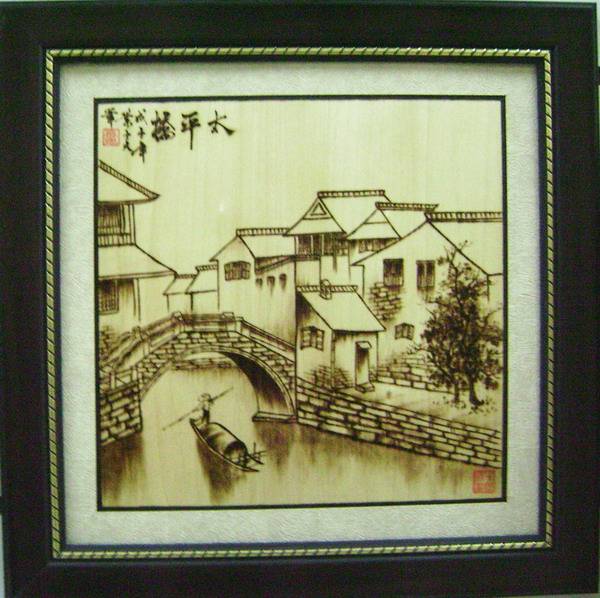 烙画:又名烫画。初为烙花,后成烙画。其源于西汉,盛于东汉。期间几经衰落,后虽被清代艺人重新整理,形成以河南为主的烙画群体!现代烙画是利用加热300-800摄氏度的特制铁烙笔和利用220v的电烙铁通过碳化原理、控温技巧以及熟练的绘画技艺,在木板、宣纸、丝绢等材料上作画。画面呈茶褐色,古朴典雅,别具一格. 郑州碧波园珍宝大世界烙艺阁画廊主要经营木板烙画,烙画的花色品种丰富,山水、花鸟、人物、动物、肖像、书法、中国画、西洋画、卡通画、大中堂、小中堂、条屏、壁画以及数十米的长卷、制作招牌、各种艺术品装裱,题材广泛,应有尽有,可以根据顾客需要的图案尺寸定做!现在正在招收学员欢迎有兴趣的朋友加入!