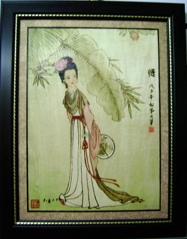 烙画:又名烫画。初为烙花,后成烙画。其源于西汉,盛于东汉。期间几经衰落,后虽被清代艺人重新整理,形成以河南为主的烙画群体!现代烙画是利用加热300-800摄氏度的特制铁烙笔和利用220v的电烙铁通过碳化原理、控温技巧以及熟练的绘画技艺,在木板、宣纸、丝绢等材料上作画。画面呈茶褐色,古朴典雅,别具一格. 郑州碧波园珍宝大世界烙艺阁画廊主要经营木板烙画,烙画的花色品种丰富,山水、花鸟、人物、动物、肖像、书法、中国画、西洋画、卡通画、大中堂、小中堂、条屏、壁画以及数十米的长卷、制作招牌、各种艺术品装裱,题材广泛,应有尽有,可以根据顾客需要的图案尺寸定做!现在正在招收学员欢迎有兴趣的朋友加入!
