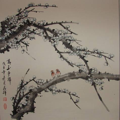 四君子之--梅.不要人夸颜色好,自留清气满乾坤.画家充分注意到了梅花的精神和品格.运用了淡雅的色调来进行表现.特别两只小鸟为画面增添了无限的情趣.