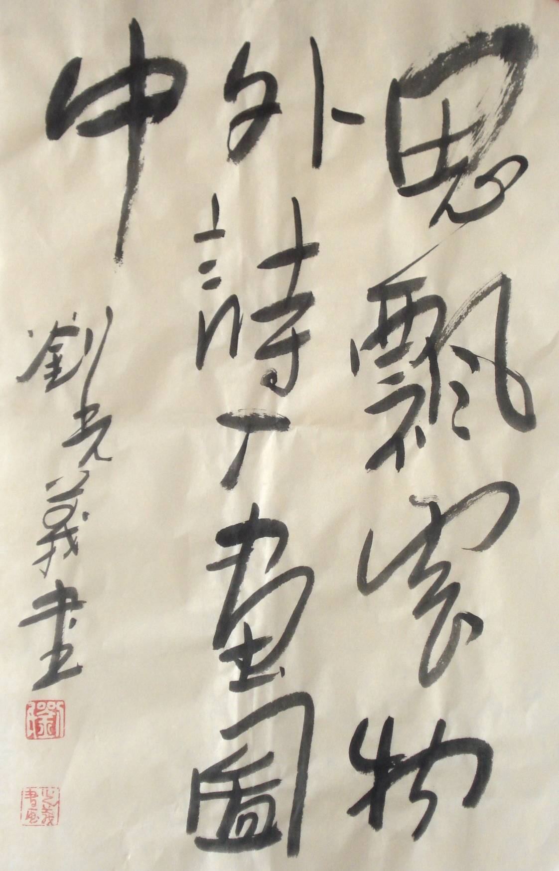 刘光义,日照市群众艺术馆综艺部主任、《群文研究》主编、全国书画考级日照考区办公室主任,日照市华艺书画院院长。山东省书法家协会会员,日照市书法家协会副秘书长,日照市民间艺术家协会副主席,山东省当代文学院院务委员,山东省《当代文苑》书画院副院长,莒县文史资料研究员。 中国毛泽东诗词书画艺术国际研究院院长张林东先生赞曰:“两手运笔,写正见反。阴阳推进,对立统一。反道一动,浑然一体。体悟天道,赏书明理。有虚有实,虚实结合。去奢去泰,不争之争。和光同尘,致虚守静。智者见智,仁者见仁。调整心态,提升艺境。协调人我,构建和谐。真艺术也。”