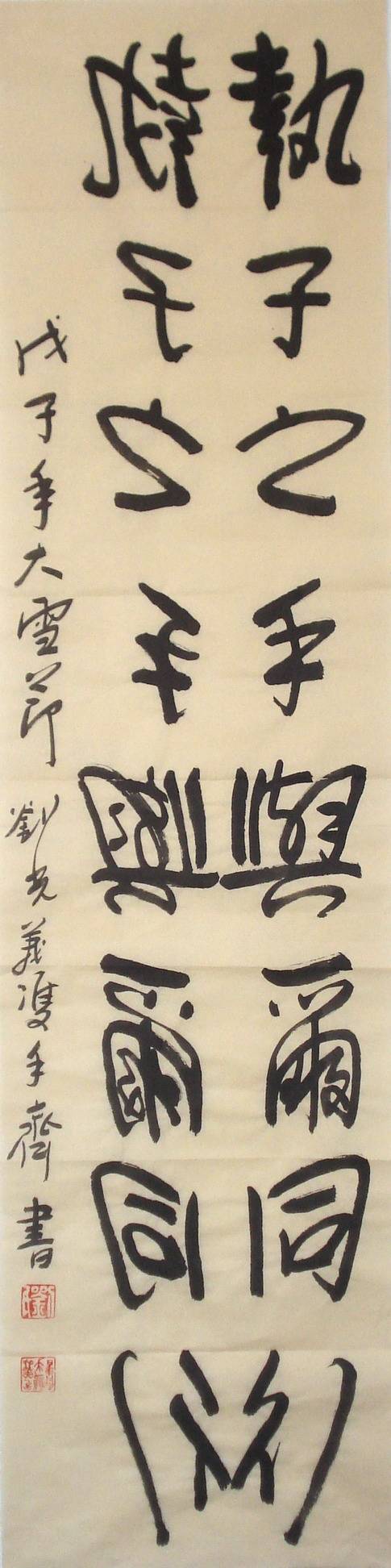 刘光义,日照市群众艺术馆综艺部主任、《群文研究》主编、全国书画考级日照考区办公室主任,日照市华艺书画院院长。山东省书法家协会会员,日照市书法家协会副秘书长,日照市民间艺术家协会副主席,山东省当代文学院院务委员,山东省《当代文苑》书画院副院长,莒县文史资料研究员。 中国毛泽东诗词书画艺术国际研究院院长张林东先生赞曰:“两手运笔,写正见反。阴阳推进,对立统一。反道一动,浑然一体。体悟天道,赏书明理。有虚有实,虚实结合。去奢去泰,不争之争。和光同尘,致虚守静。智者见智,仁者见仁。调整心态,提升艺境。协调人我,构建和谐。真艺术也。”