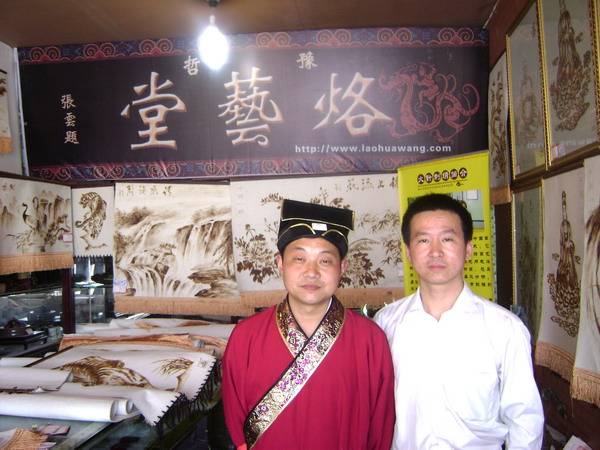 李哲:人称烙画李,河南开封人,山东省艺术学院毕业;现为开封清明上河园豫哲烙艺堂堂主,主攻中国传统民间绝活,微雕、木雕、糖画,但让艺术界称绝的还是李哲的羊毛毡烙画,其作品多次在国内外展会上获奖;二零零四接受中央电视台《致富经》栏目的专访,承做为嘉宾主持过多期河南省人民广播电台《艺苑风景线》节目,香港大公报,齐鲁晚报、河南商报等媒体也承相继报道过李哲及获奖作品。   二零零一年在北京举办的中国民俗绝艺展上我国著名的史学家,文物鉴定家,学者史树青老先生看了李哲的作品后欣然题笔:观其烙下英雄,须眉毕具,馨颏相闻,观其线条刀刻刃划,爽辣劲利,似闻铮铮金石之声,固知其志也。又间以世态,杂以诙谐,展辟意境,宣发理趣,戛戛独造,迥不忧人。从其图版人物到环衬烙者,足见其艺术之功底,相信识者能辫之。   凭借着李哲深厚的艺术功底创造性的用电烙铁在羊毛毡上烙出各种人物画、花鸟画、风景画等作品。画面层次分明,虚实相衬,线条疏密有致,有较强的立体感觉!