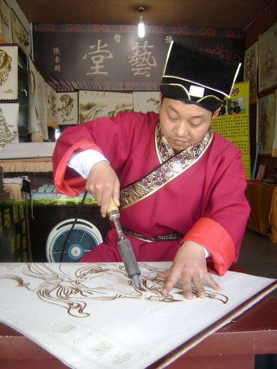 李哲:人称烙画李,河南开封人,山东省艺术学院毕业;现为开封清明上河园豫哲烙艺堂堂主,主攻中国传统民间绝活,微雕、木雕、糖画,但让艺术界称绝的还是李哲的羊毛毡烙画,其作品多次在国内外展会上获奖;二零零四接受中央电视台《致富经》栏目的专访,承做为嘉宾主持过多期河南省人民广播电台《艺苑风景线》节目,香港大公报,齐鲁晚报、河南商报等媒体也承相继报道过李哲及获奖作品。   二零零一年在北京举办的中国民俗绝艺展上我国著名的史学家,文物鉴定家,学者史树青老先生看了李哲的作品后欣然题笔:观其烙下英雄,须眉毕具,馨颏相闻,观其线条刀刻刃划,爽辣劲利,似闻铮铮金石之声,固知其志也。又间以世态,杂以诙谐,展辟意境,宣发理趣,戛戛独造,迥不忧人。从其图版人物到环衬烙者,足见其艺术之功底,相信识者能辫之。   凭借着李哲深厚的艺术功底创造性的用电烙铁在羊毛毡上烙出各种人物画、花鸟画、风景画等作品。画面层次分明,虚实相衬,线条疏密有致,有较强的立体感觉!