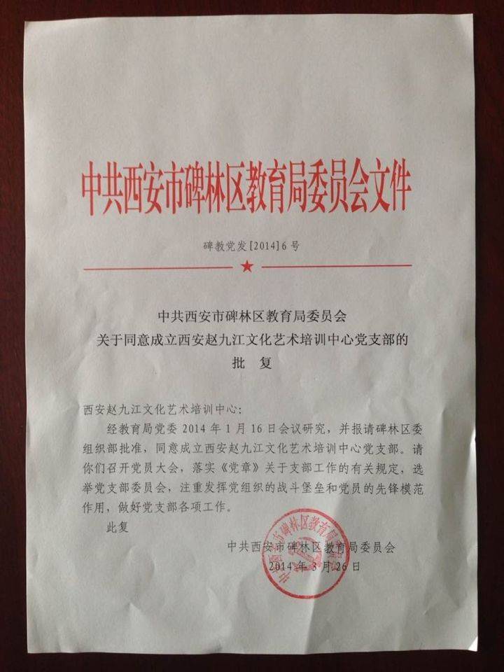 会上教育局党委组织部宣读了碑林区教育局委员会同意成立西安赵九江文化艺术培训中心党支部的批复。