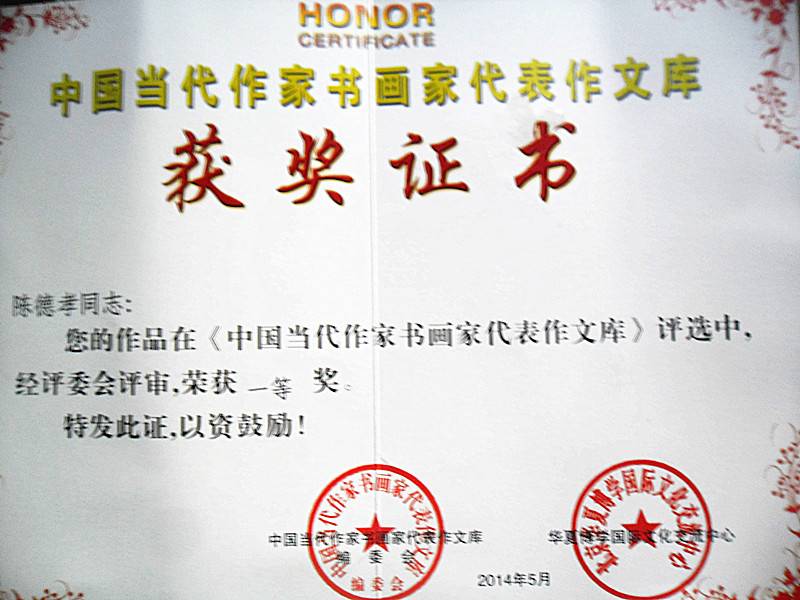 《中国当代作家书画家代表作文库》评选中,陈德孝作品获一等奖。